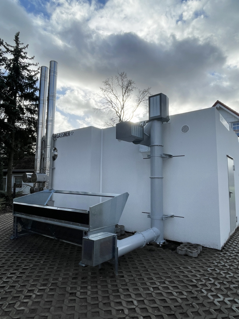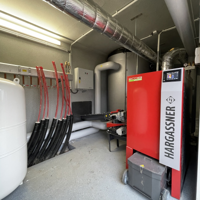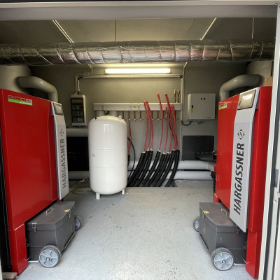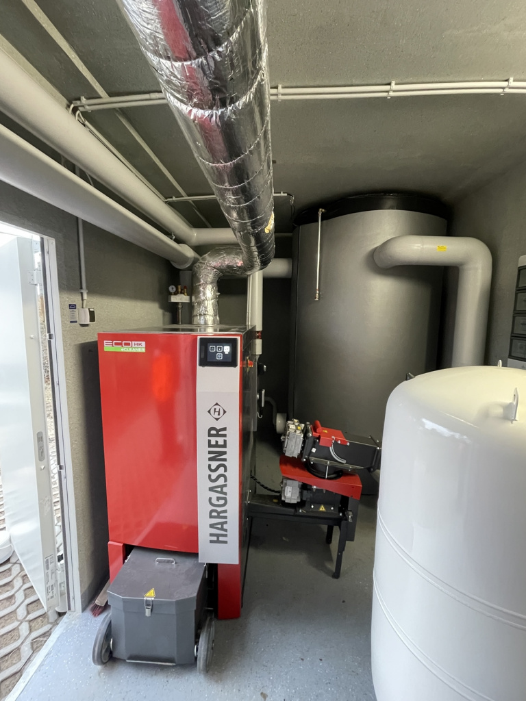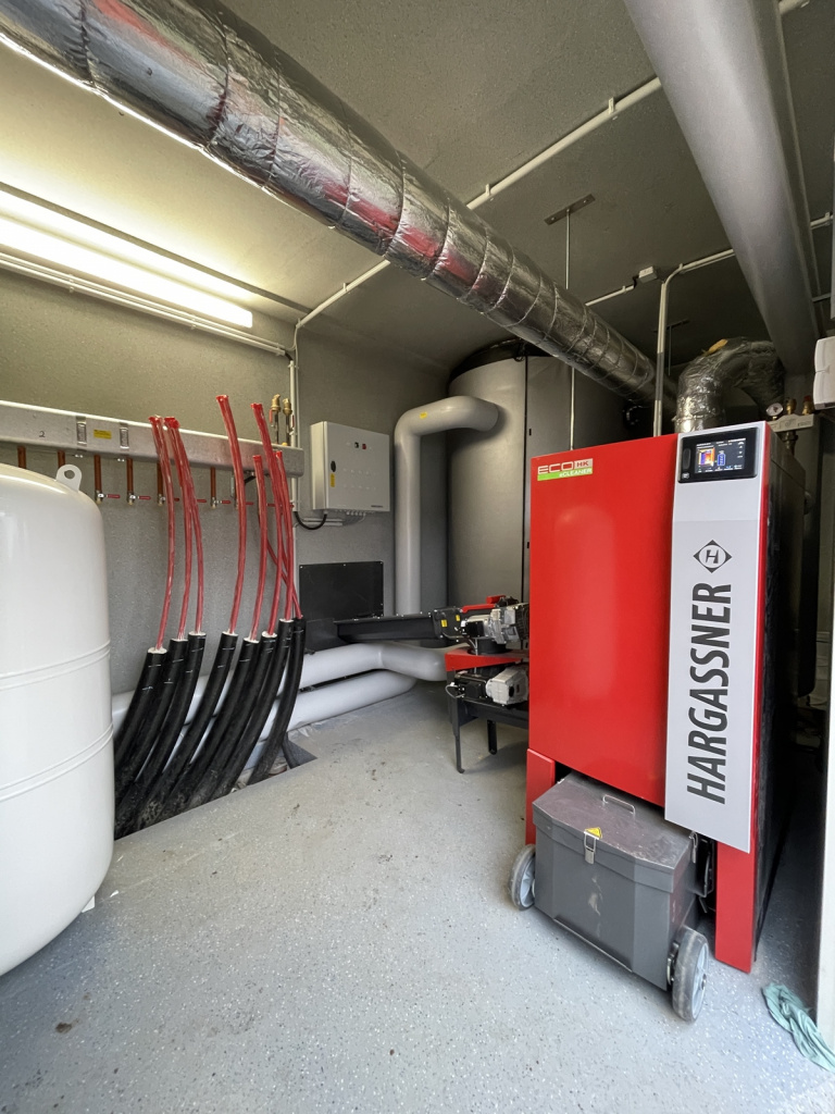 Dieses Biomasse-Heizmodul wurde von uns zu Beginn des Jahres 2024 errichtet. Zwei Hackgut-Heizkessel mit einer Systemleistung von 180 kW versorgen hier mehrere Wohngebäude mit nachhaltiger Wärme. Im Heizmodul befinden sich neben den beiden Hackschnitzel-Heizkesseln zwei Pufferspeicher mit je 3000 Litern. Über einen Verteiler gelangt die Wärme in die verschiedenen Gebäude. Die in den Heizkesseln integrierten eCleaner sorgen für eine noch sauberere Verbrennung.