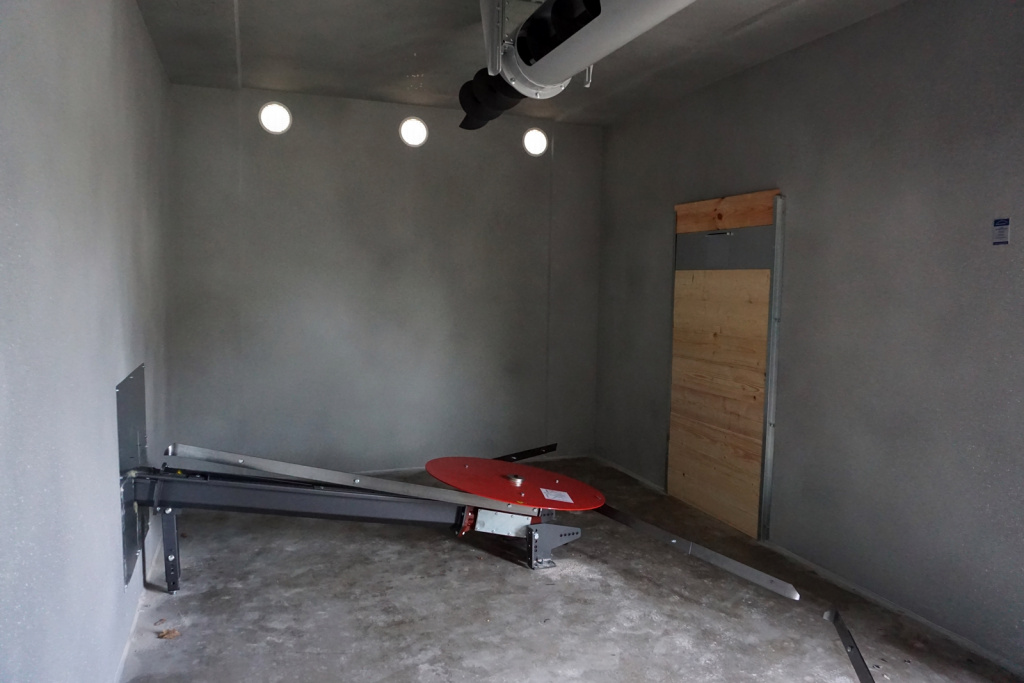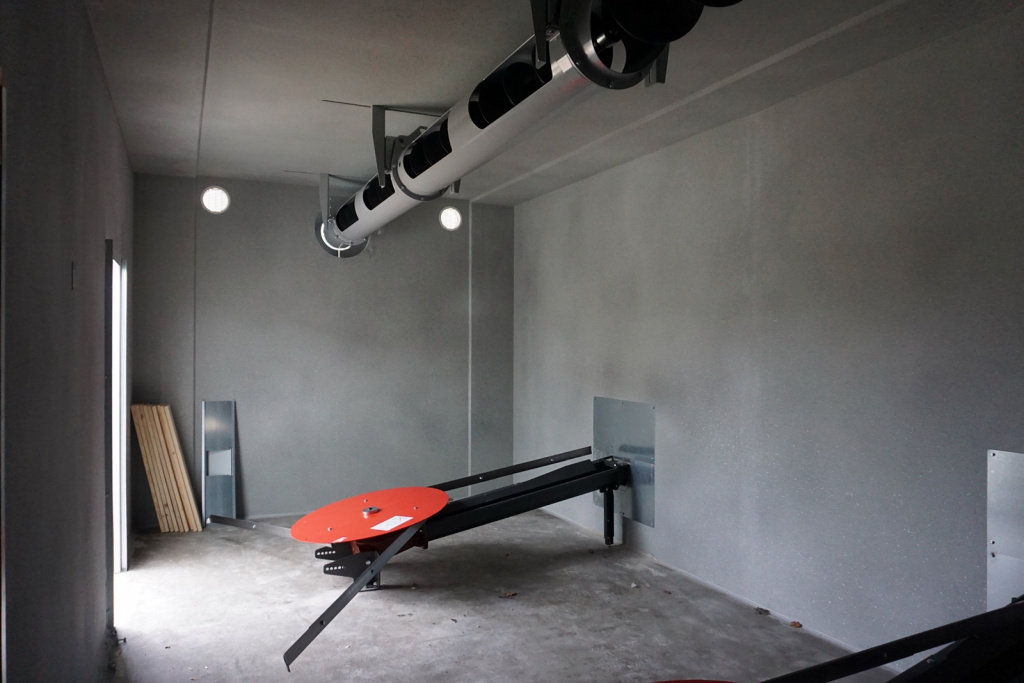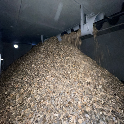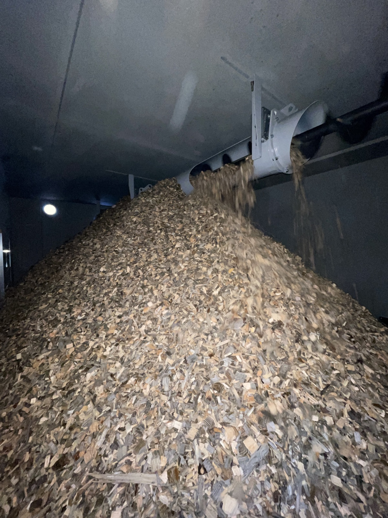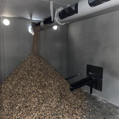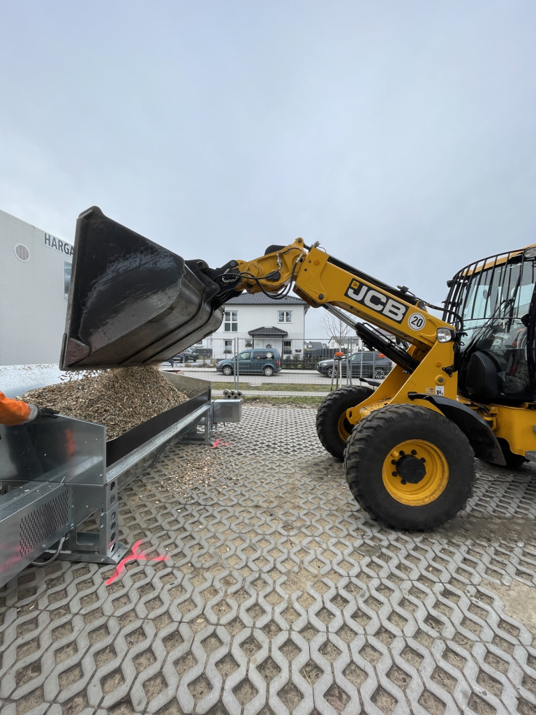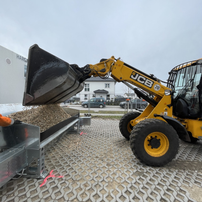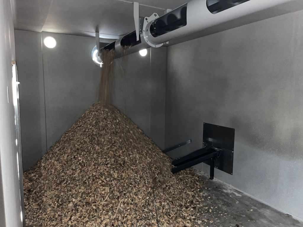 Zur Befüllung des angrenzenden Lagermoduls dient ein Trog, welcher das Brennmaterial mittels Schneckenaustragung in dieses hinein befördert. Von hier aus transportieren die beiden Raumaustragungen das Brennmaterial zu den jeweiligen Hackgut-Heizkesseln.