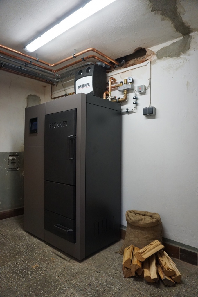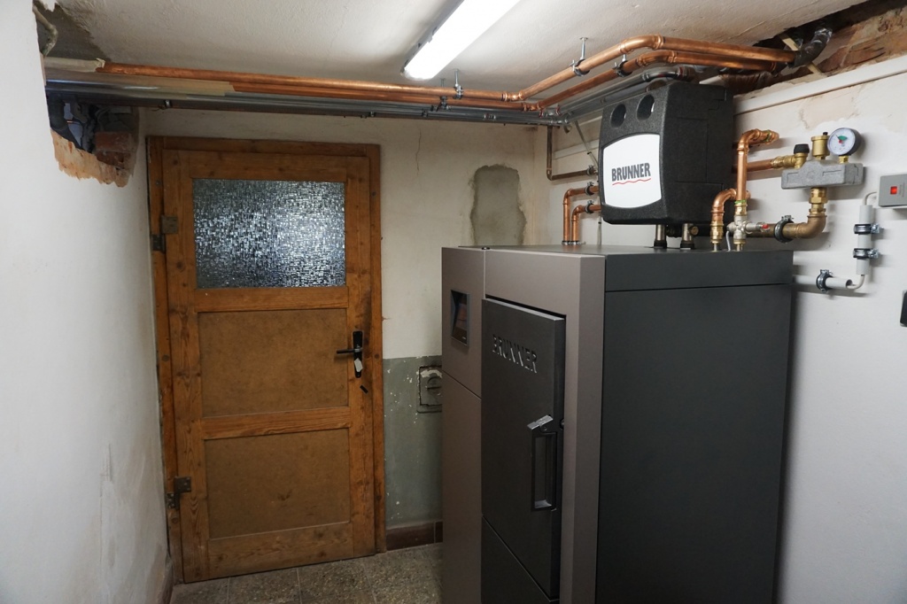 Für das kleine Einfamilienhaus ist der Scheitini Naturkraftkessel von Brunner wie gemacht und bietet großen Komfort beim Heizen. Der Füllraum fasst 33cm Holzscheite und ist bequem durch die große Fülltür aus massivem Guss zu bestücken. Da Familie Prager eigenes Holz hat entschieden Sie sich für einen Stückholzkessel, welchen Sie aber auch in Zukunft mit anderen Materialien anschüren können. Denn das Besondere am Naturkraftkessel von BRUNNER ist sein Aufbau. Der Abbrand erfolgt nicht wie bei einem normalen Sturzbrandkessel nach unten, sondern zur Seite. So kann der kleine Kessel auch Hackschnitzel, grobe Kanthölzer, Bretter und Holzbriketts verbrennen. Das gestaltet sich bei einem Kessel mit unterem Abbrand meist schwieriger und kann sogar zum Ausgehen des Feuers führen. Hier muss dann das gesamte Material aus dem Kessel geräumt werden – das passiert beim Scheitini nicht!