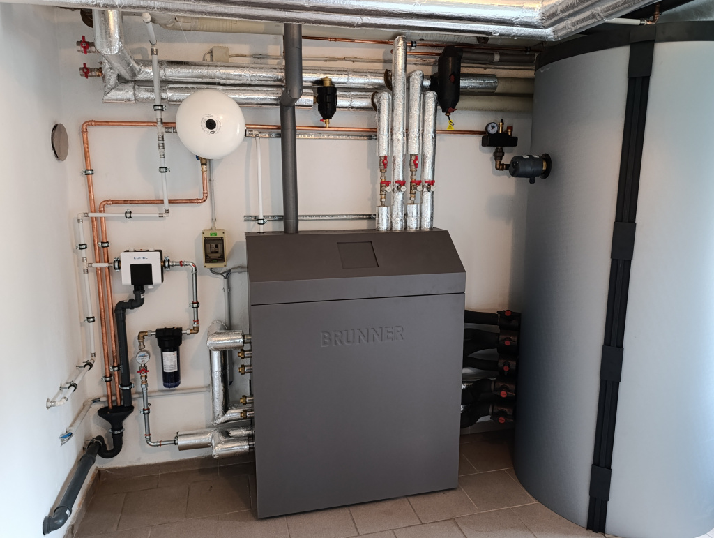 Um das Zweifamilienhaus komfortabel und zukunftssicher zu beheizen fiel nach unserer Beratung die Entscheidung auf einen Brunner Scheitholzvergaserkessel mit Heizzentrale und insgesamt 4000 Liter Pufferspeicher. Die neue Holzheizung ermöglicht nun eine wesentliche bequemere Bedienung, was auch an der automatischen Zündung des Brunner-Kessels liegt. Die Heizzentrale verteilt dabei die Wärme intelligent an Heizung und die integrierte Frischwasserstation zur Warmwasseraufbereitung.