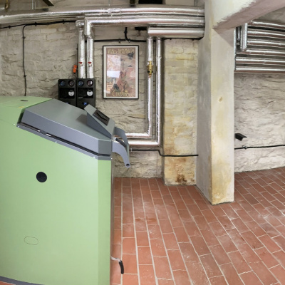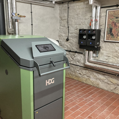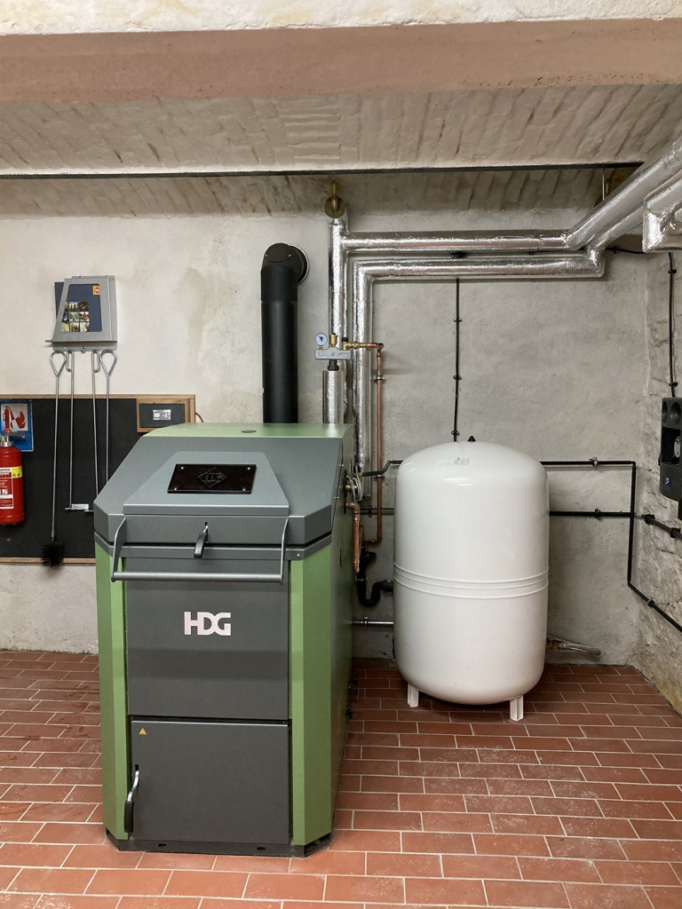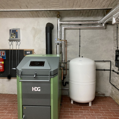 Die alte Gasheizung wurde hier durch eine moderne Holzheizung von HDG ersetzt. Der Holzvergaserkessel ist robust mit 10 mm Stahlblech im Füllschacht gebaut. Da hier auch Restholz verbrannt werden soll und eine lange Lebensdauer gewünscht war, ist der Holzheizkessel zusätzlich mit der HDG-Schuppenauskleidung ausgestattet. Diese eingeschweißte feuerbeständige Spezialblechausstattung dient zur zusätzlichen Verstärkung des Füllschachtes.