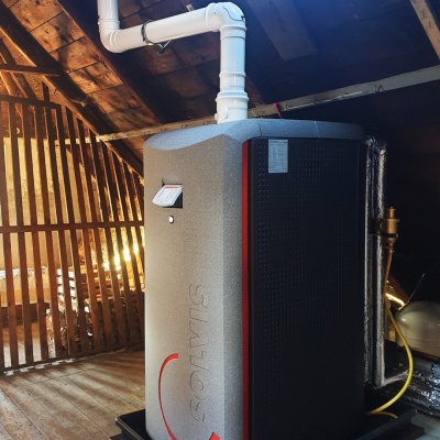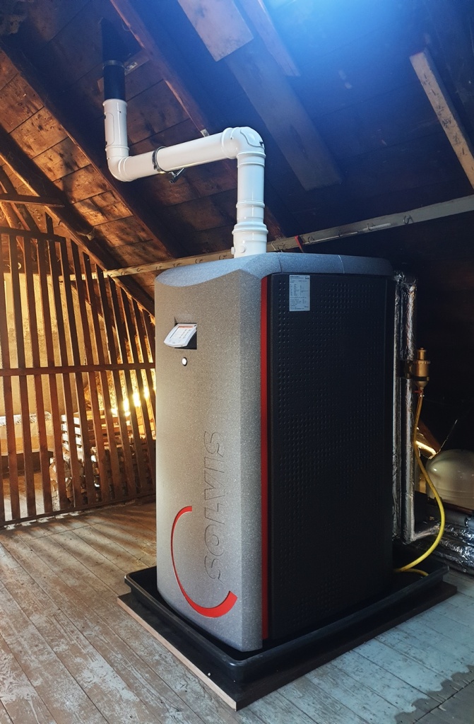 In diesem Mehrfamilienhaus ist die bisher verbaute Gastherme und der, in die Jahre gekommene und unhygienische Warmwasserspeicher einem modernen SolvisBen gewichen. Unser Kunde wollte am Anfang eigentlich nur eine neue Solarthermieanlage und eine neue Warmwasserbereitung installieren lassen. Dies wäre auch ohne den SolvisBen möglich gewesen. Jedoch würde so eine Anlage dann aus zahlreichen Komponenten und mehreren Regelungen bestehen, welche sich nicht miteinander unterhalten und sinnvoll die Anlage regeln könnten. Das ist nicht unser Anspruch. Wir wollen effiziente und langlebige Technik verbauen, deshalb schlugen wir den SolvisBen vor. Dieser kann nämlich Solaranlage, Warmwasserbereitung und Heizung mit nur einem Regler ansteuern. So weiß jede Komponente der Anlage was sie zu tun hat und vor allem wann die Sonne scheint und der Gasbrenner ausbleiben kann. Da die Gastherme erst 6 Jahre alt war bestand die Überlegung diese bestehen zu lassen. Dies wäre problemlos möglich gewesen und bei einem Defekt könnte man jederzeit den Gasbrenner direkt in den SolvisBen, ohne großen Aufwand nachrüsten. Unser Kunde entschied sich jedoch gleich für das Komplettpaket. So kann der SolvisBen hier sein ganzes Energiesparpotenzial ausleben!