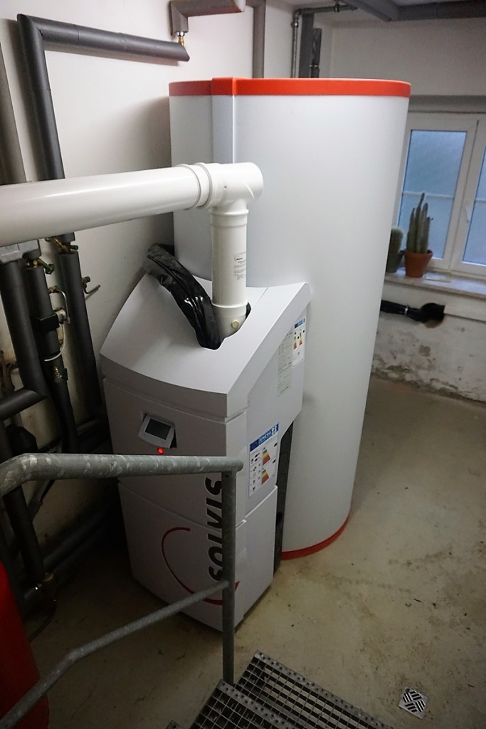 Anlage: | SolvisMax 957 mit 30kW Gasbrenner, Solarübergabestation mit 8 SolvisCala-Kollektoren und Warmwasserstation |