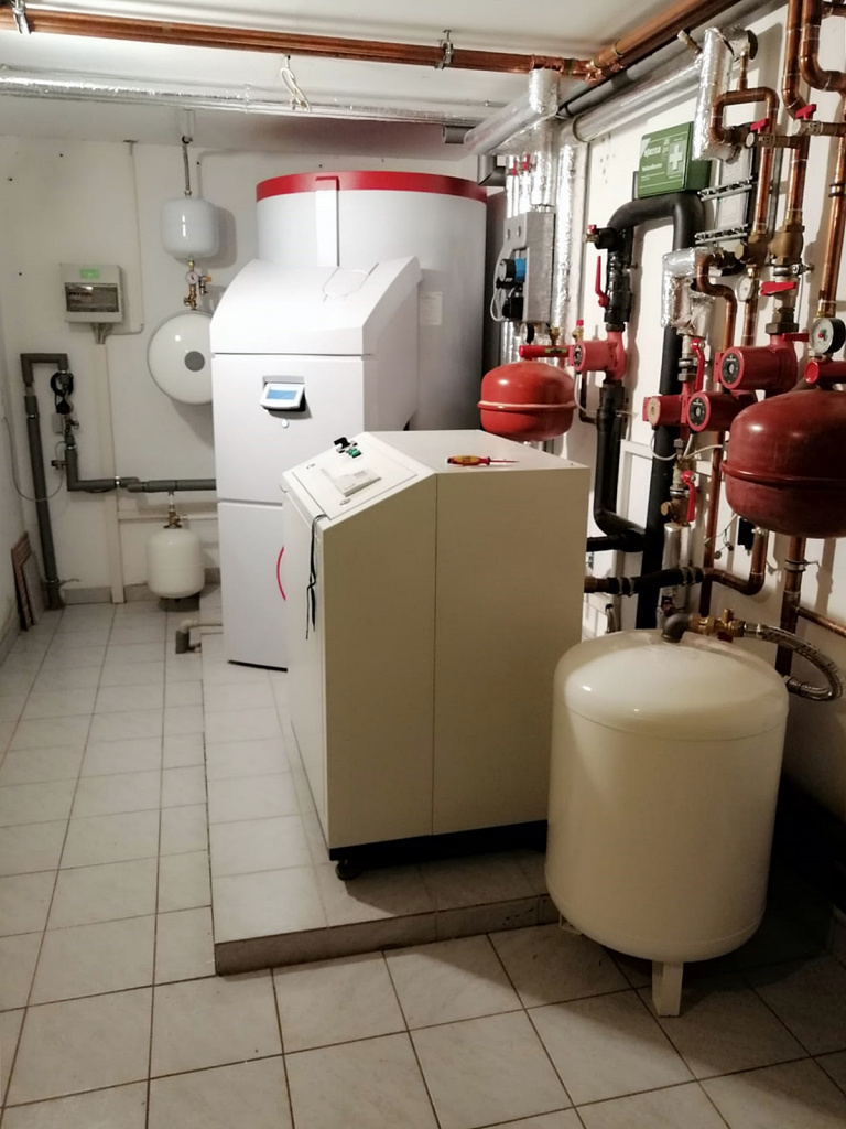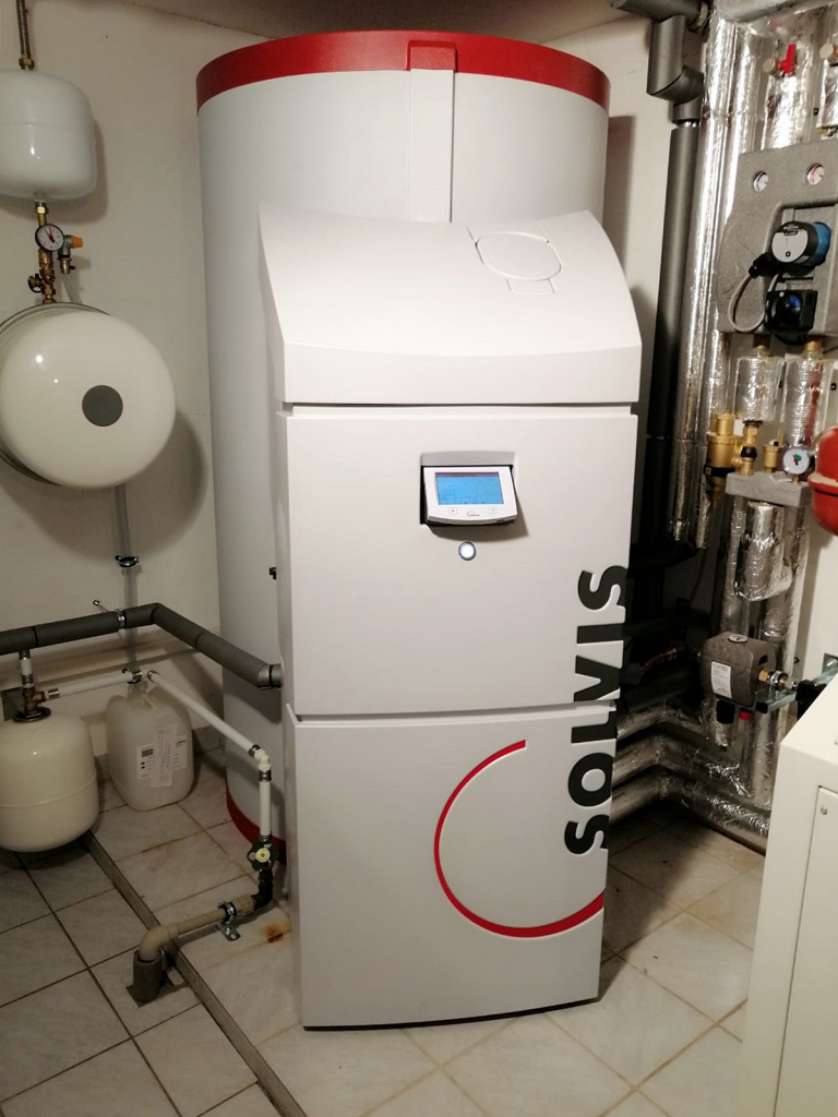 Aufgrund einer Leckage am alten 500 Liter großen Warmwasserspeicher musste an dieser Heizungsanlage etwas passieren. Einen neuen so großen Speicher für Warmwasser zu installieren kam für uns nicht in Frage. Dieser wurde damals von einer anderen Firma, als Lastausgleich zusammen mit der Erdwärmepumpe installiert. 500 Liter warmes Trinkwasser zu bevorraten ist in einem Einfamilienhaus, aufgrund des geringeren täglichen Verbrauchs und der damit verbundenen hygienischen Probleme nicht sinnvoll. Deswegen entschieden sich unsere Kunden nach unserer Beratung für ein Heizsystem von Solvis.