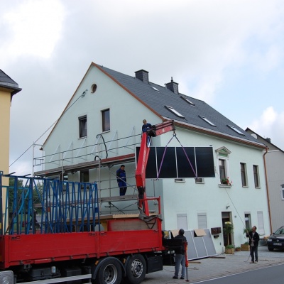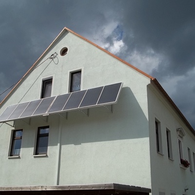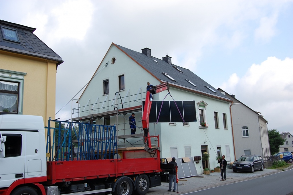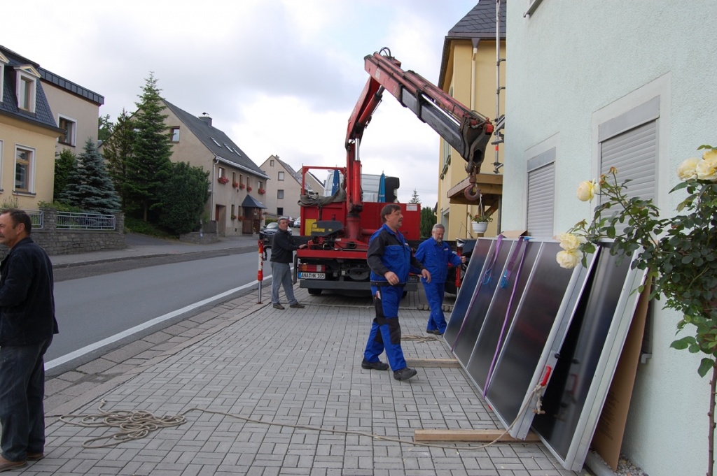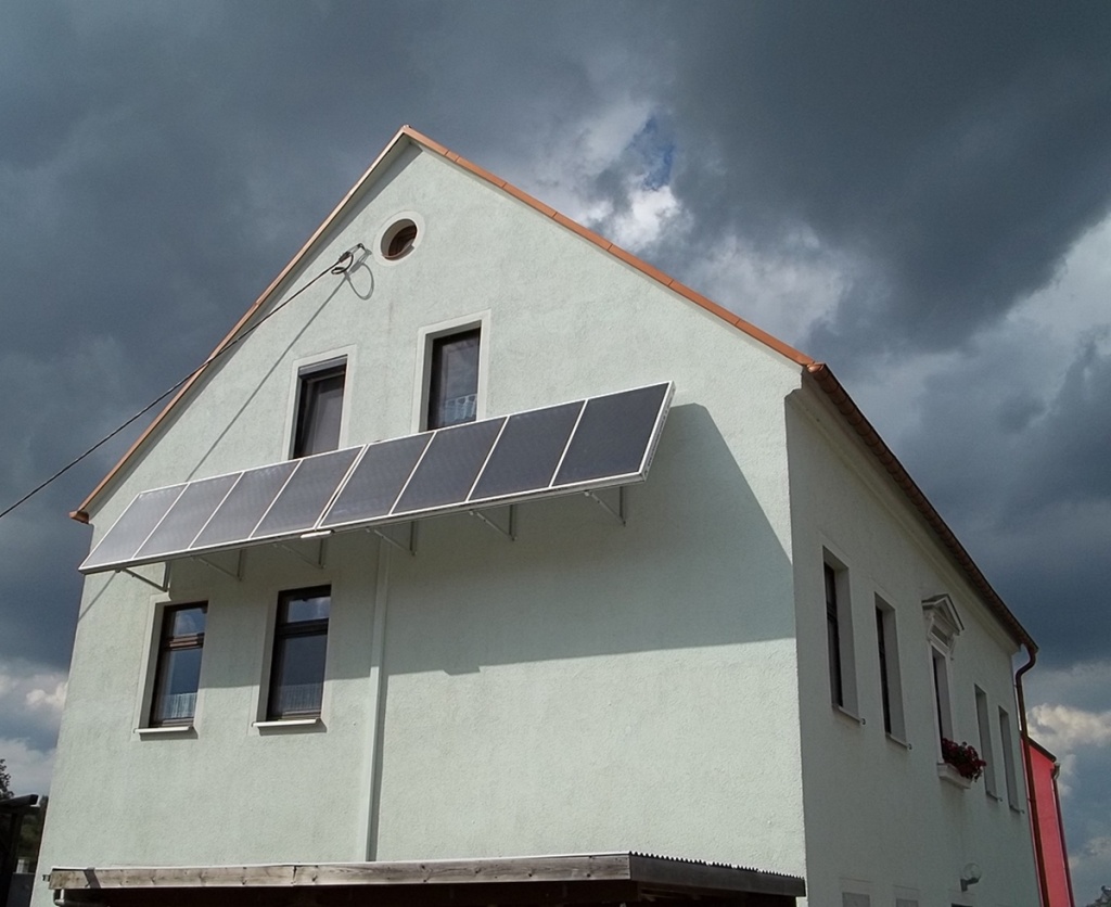 Die solarthermische Anlage an der Hauswand anzubringen, war ebenfalls ein Vorschlag von Herrn Schönfelder, welchen wir noch gar nicht in Betracht gezogen hatten. Auch hier sollte sich dieser Vorschlag als optimale Lösung herausstellen, da die Fassade genau nach Süden ausgerichtet ist. Durch den Neigungswinkel von ca. 67° erzielt die Anlange auch in den Wintermonaten ausreichend Wärme, um die Heizung zu unterstützen.