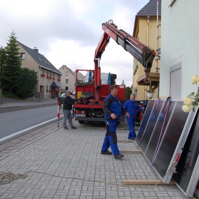 Nach einer ausführlichen Beratung durch die Schönfelder GmbH entschieden wir uns für das beste System, welches verfügbar war – ein SolvisMax mit 25 kW Leistung sowie der Kollektortyp SolvisFera mit einer Gesamtfläche von 11,22m². Der Speicher des SolvisMax hat ein Volumen 650 Liter. Obwohl wir von einem anderen Heizungsbauer den Rat bekommen hatten, einen Speicher von 1.000 Liter zu nehmen, empfahl uns Herr Schönfelder das kleinere Modell zu nehmen. Im Nachhinein hat sich dies als richtig herausgestellt. Ein größerer Speicher hätte deutlich mehr Kosten verursacht und die größere Menge wenig Nutzen erzielt. Im Sommer reicht der Speicher für die Warmwasseraufbereitung mehr als aus, im Winter wird die durch die Solarthermieanlage erzeugte Wärme sofort verwendet, so dass sich auch hier die Wahl des kleineren Speichers rentiert.